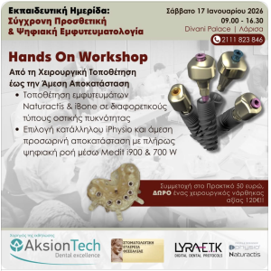 Αγαπητές και αγαπητοί Συνάδελφοι H Στοματολογική Εταιρεία Θεσσαλίας διοργανώνει ημερίδα Εμφυτευματολογίας (θεωρητικό και πρακτικό μέρος) στις 17 Ιανουαρίου 2026. Η εκδήλωση θα πραγματοποιηθεί στην Λάρισα, στο ξενοδοχείο Divani Palace Larissa (Παπαναστασίου 19). Η συμμετοχή είναι δωρεάν για το θεωρητικό μέρος της ημερίδας. Για το πρακτικό μέρος, κόστος συμμετοχής 50 ευρώ (δώρο από την εταιρεία AksionTech σε κάθε συμμετέχοντα του πρακτικού, χειρουργικός νάρθηκας αξίας 120ευρώ). Ο αριθμός των συμμετεχόντων στο πρακτικό μέρος είναι περιορισμένος. Θα τηρηθεί σειρά προτεραιότητας. Για δηλώσεις συμμετοχής επικοινωνήστε με τον Γραμματέα της Στοματολογικής Εταιρείας Κο Τσολάκη Γιάννη. Η εκδήλωση θα μοριοδοτηθεί από το ΙΕΘΕ. Το πρόγραμμα επισυνάπτεται. Χορηγός της εκδήλωσης είναι η εταιρεία AksionTech. Για το ΔΣ Ο Πρόεδρος Ο Γραμματέας Γιάννης Αετόπουλος Γιάννης Τσολάκης